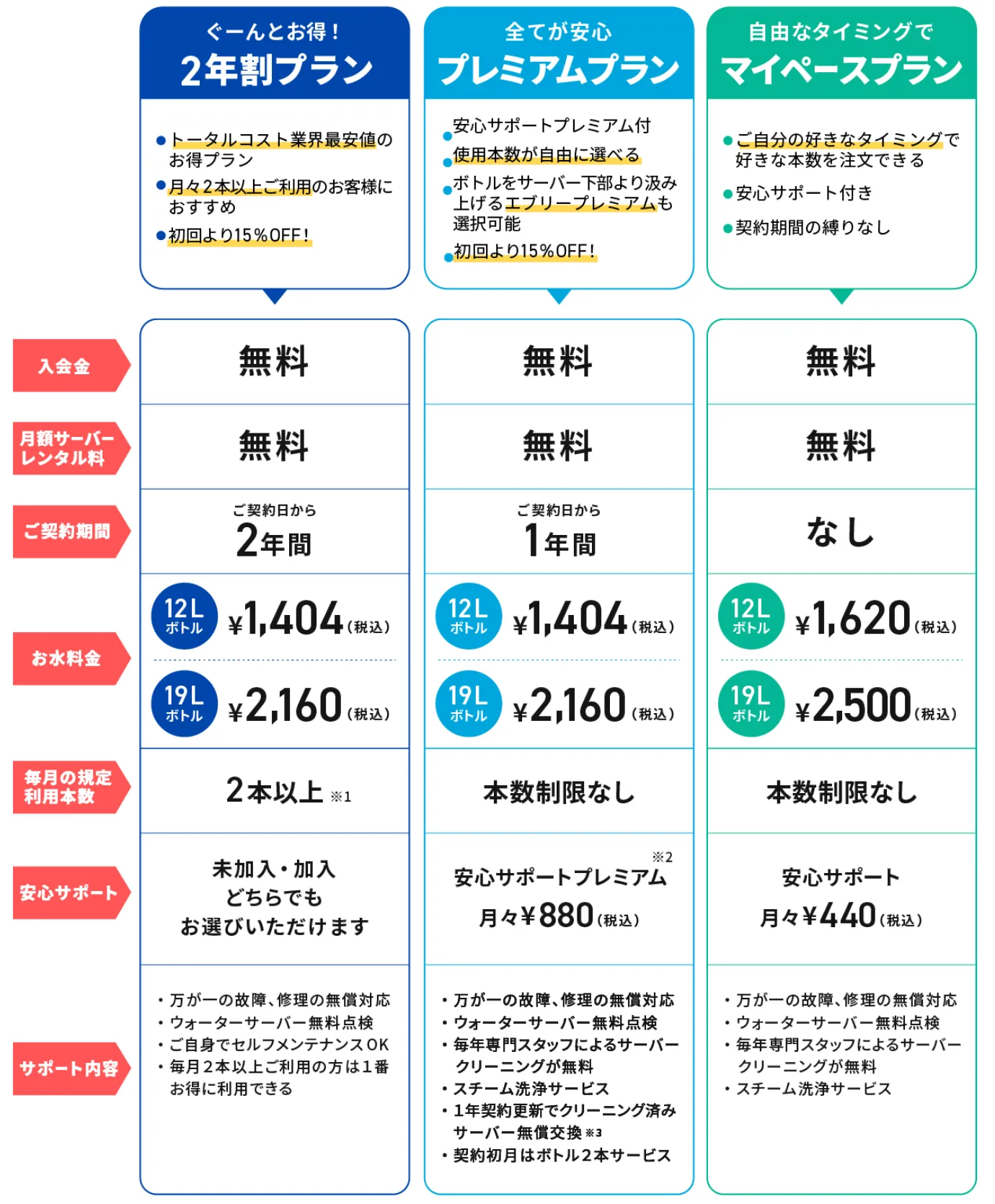 ※1各プランによる規定本数に満たなかった場合でも「サーバーチャージ料550円(税込)」をご負担頂くことで解約扱いにならずご契約を継続していただく事が可能です。3ヶ月を連続した場合はお水の品質、衛生面に影響を及ぼす可能性があるため解約 扱いとなります。